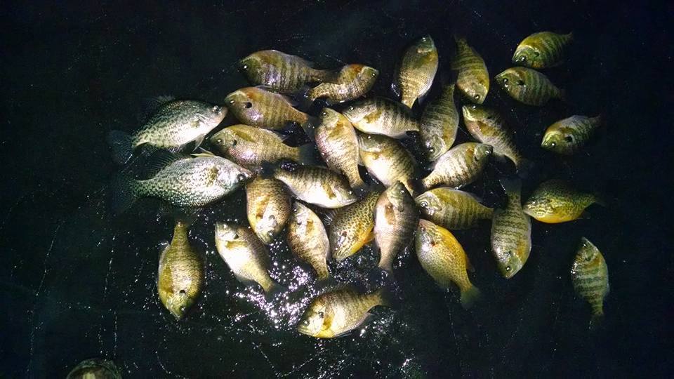 Early Morning has been the best bite. Some are doing well in the evening and late into the night too. Crappies are starting to show up in better numbers too. Anglers caught a few real nice ones up to 14"! Most are 8-11 inches though. Bluegills and perch have been the predominant catch. Perch vary in size with some small ones and some very large ones. Glow, green, pink, and silver have been the most popular jig choices. 5-6 fow has been productive on the stumps end.